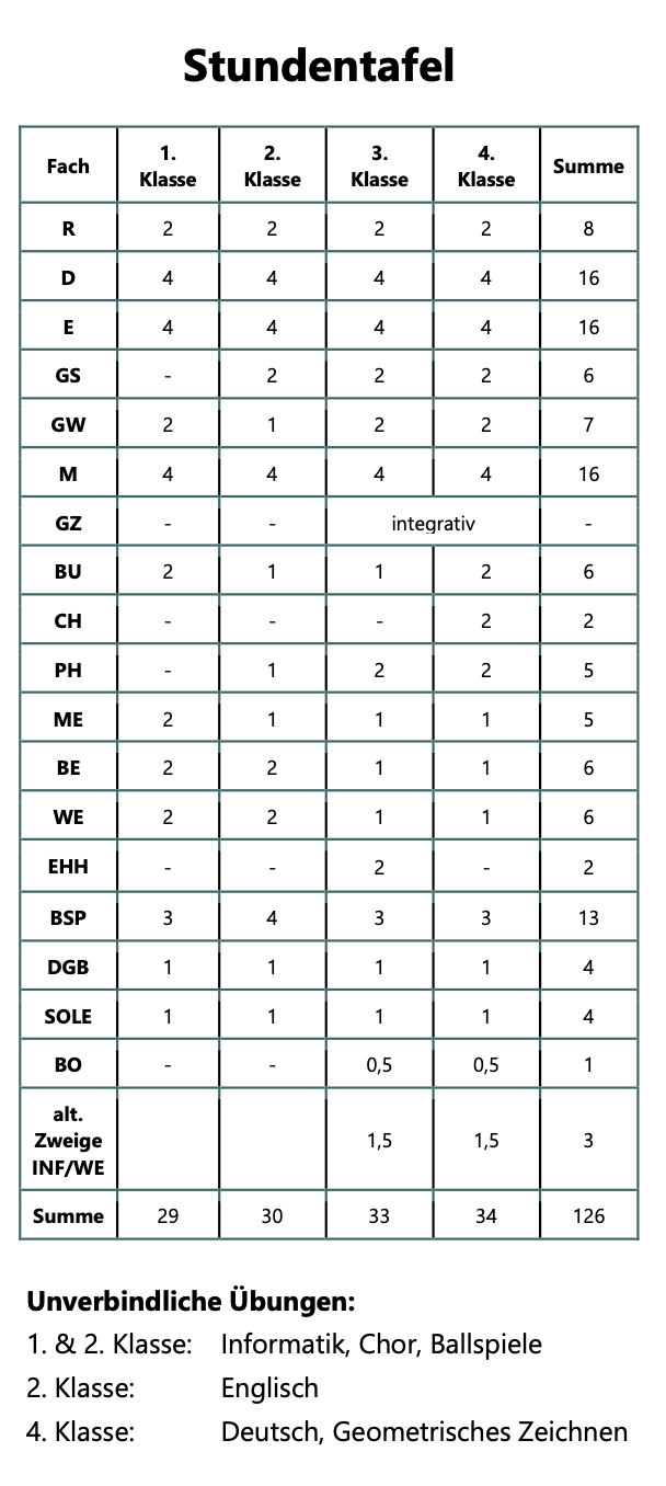 In unserer Stundentafel wird die Anzahl der Unterrichtsstunden festgelegt, die in den verschiedenen Klassen- bzw. Jahrgangsstufen auf die jeweiligen Unterrichtsfächer entfallen.